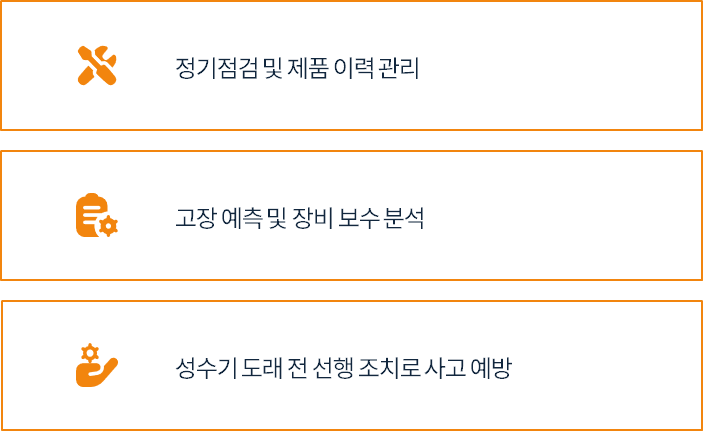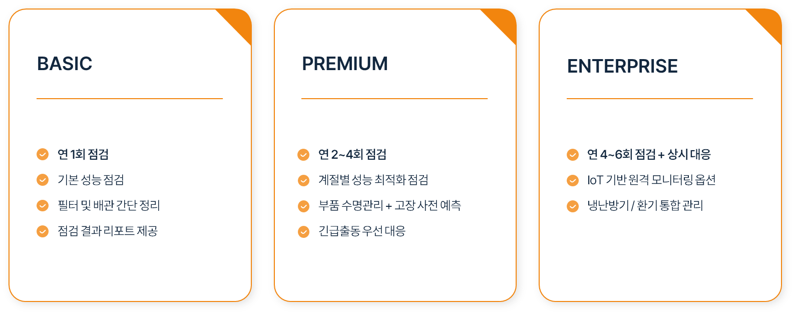 철저한 품질보증과 정기점검, 사후 A/S까지 책임지는 유지보수 케어서비스를 제공합니다.
